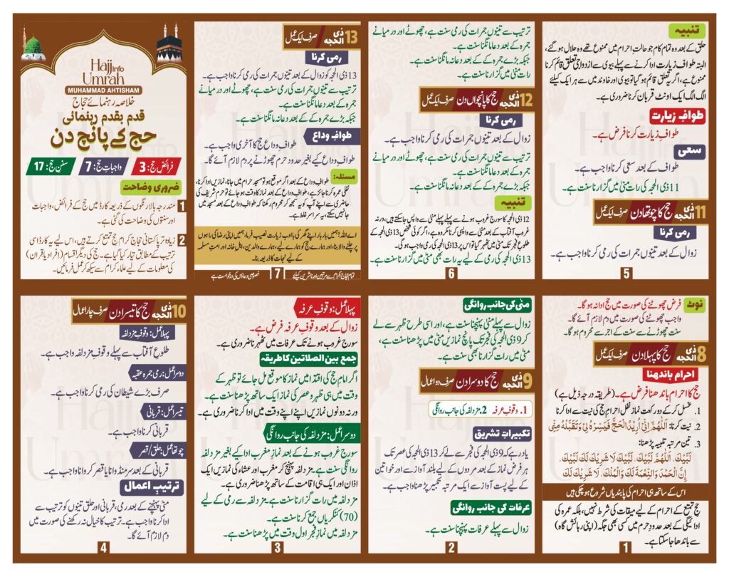 اس تصویر (انفوگرافک) میں موجود حج کے پانچ دنوں کی پوری وضاحت سادہ اور آسان اردو میں کی گئی ہے۔ یہ تصویر قدم بہ قدم بتاتی ہے کہ ہر دن حاجی کو کیا کرنا ہوتا ہے۔